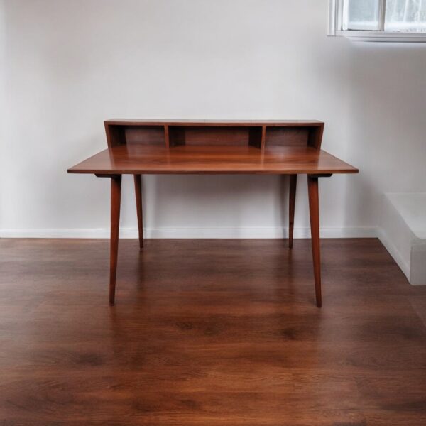 Our Mid-Century style studio desk combines timeless design with modern functionality. Featuring elegant tapered legs and a unique three-space crown compartment on top, this desk offers the perfect blend of style and practicality for your workspace. Ideal for organizing essentials, while keeping your surface clutter-free.